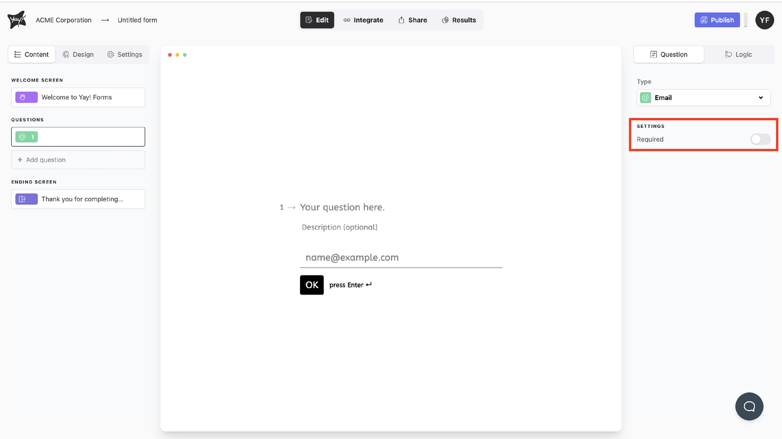 Nesse artigo, você aprenderá como configurar um tipo de pergunta que permite que os usuários insiram um endereço de e-mail, incluindo como selecionar o tipo correto, editar o texto da pergunta, adicionar uma descrição e ajustar as configurações.